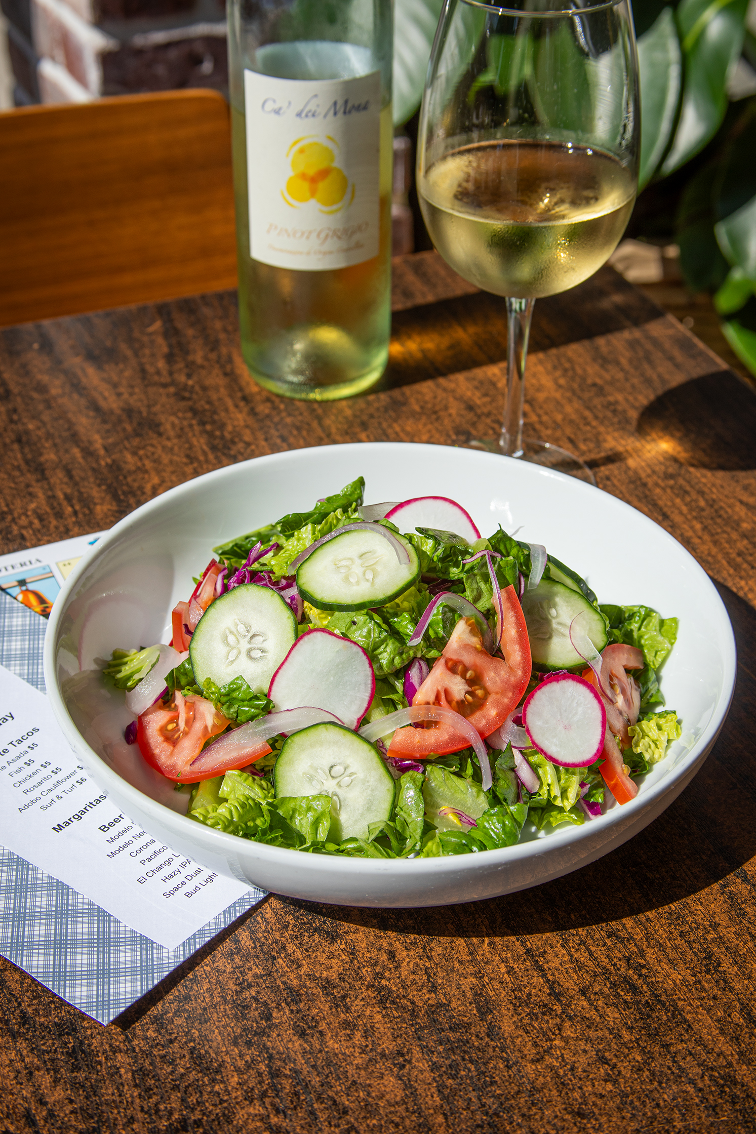 - Vibrant garden salad with white wine bottle, glass on wooden table.