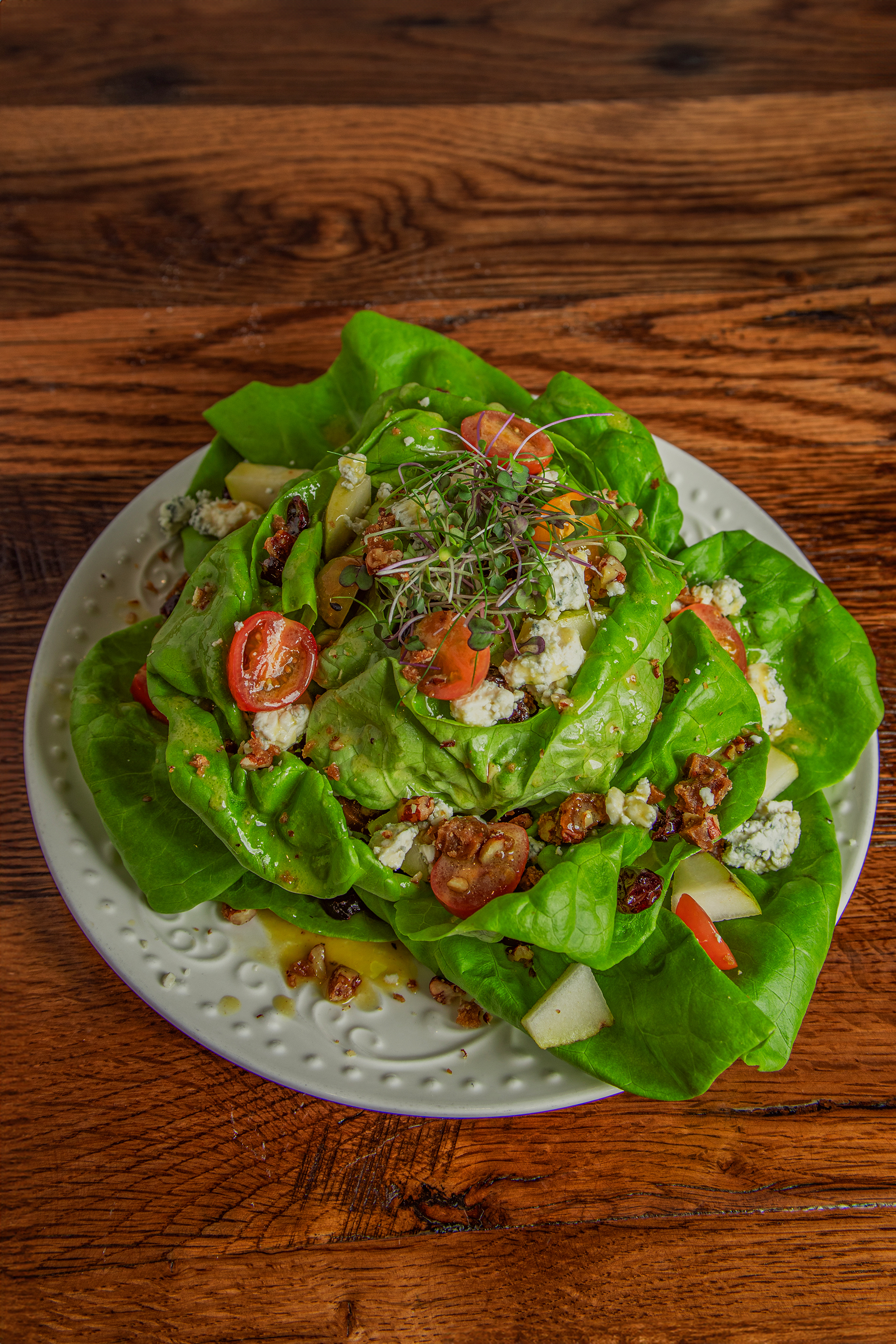 - Crisp wedge salad with bacon, red onion, toast, white wine, food photographer.